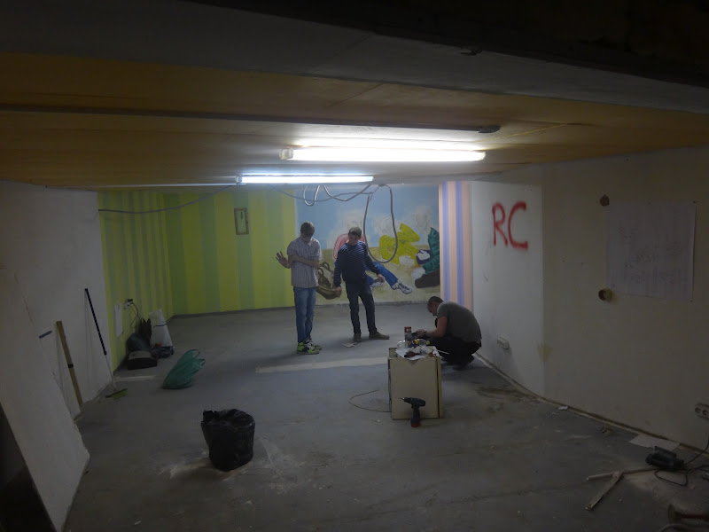 Сегодня мы разобрали 2 стены, слегка затерли пол, подключили одну из вытяжек и начали собирать новую стену.